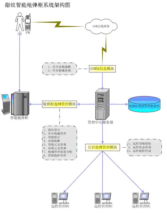 (4)門禁、安防級聯功能:系統或與門禁、安防系統聯網,使用槍單位內部形成一指通。